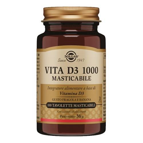 VITA D3 1000MASTICABILE Descrizione Integratore alimentare a base di vitamina D3. La vitamina D contribuisce alla normale funzione del sistema immunitario, al mantenimento della normale funzione muscolare e al mantenimento di ossa e denti normali. Gusto fragola e banana. Con zuccheri ed edulcoranti. Ingredienti Zucchero di canna, fruttosio; edulcorante: xilitolo; agente di carica: cellulosa microcristallina; amido modificato, maltodestrina da mais; agente antiagglomerante: acido stearico vegetale; aromi naturali: fragola e banana; regolatori di acidità: acido citrico e acido malico; agente antiagglomerante: biossido di silici...